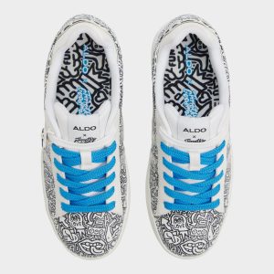 Street-art doodles bloom across buttery leather, blue laces popping against a cushioned sole that keeps every stride confident as you chase detours and second coffees through the city streets, stations, and sunny plazas. Pair with cropped denim for brunch runs, or slip under a floaty midi as gallery nights turn into sidewalk soirees.