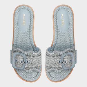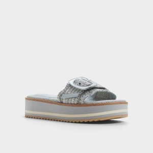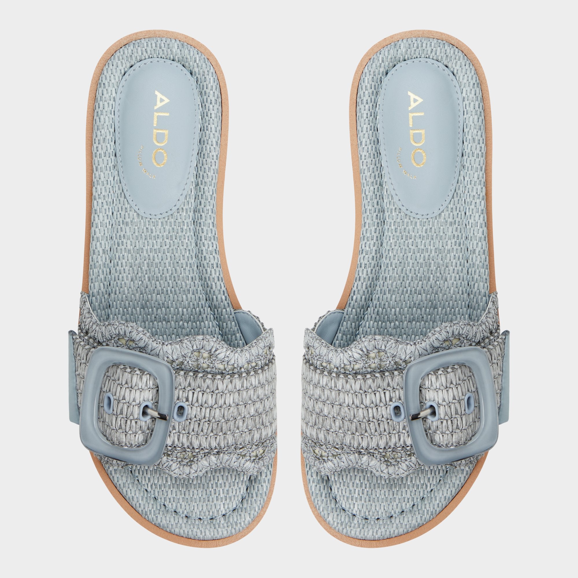 Rippled sky-tinted raffia strap frames oversized tone-on-tone buckle atop cushy striped flatform sole gifting extra height without wobble so seaside strolls city errand loops feel like walking on mellow clouds. Pair cropped denim linen shirt for market mornings or ground floaty midi when patio dinners stretch past sunset.