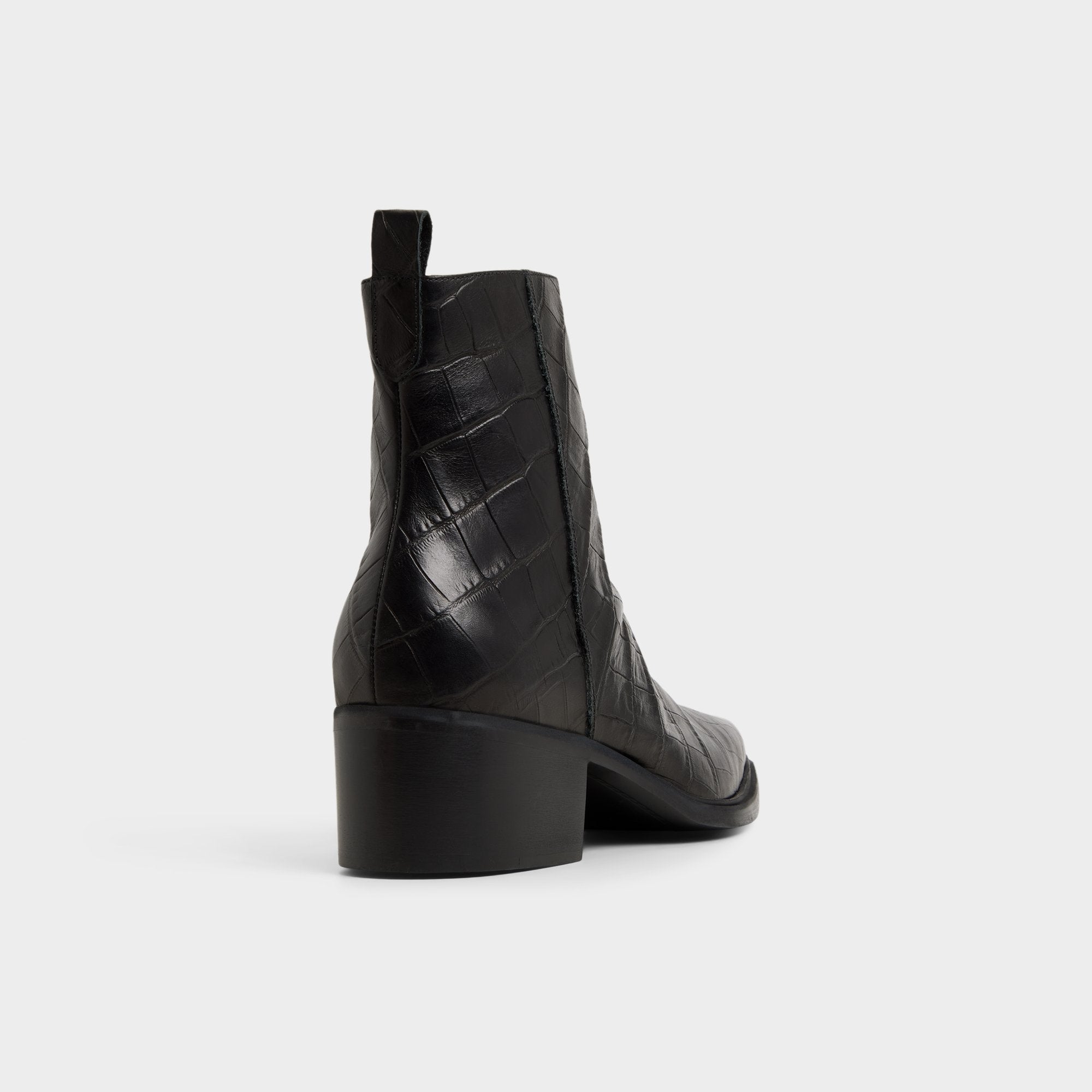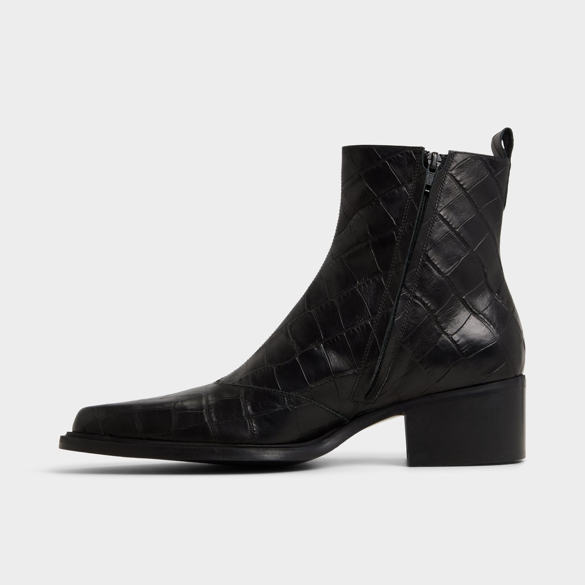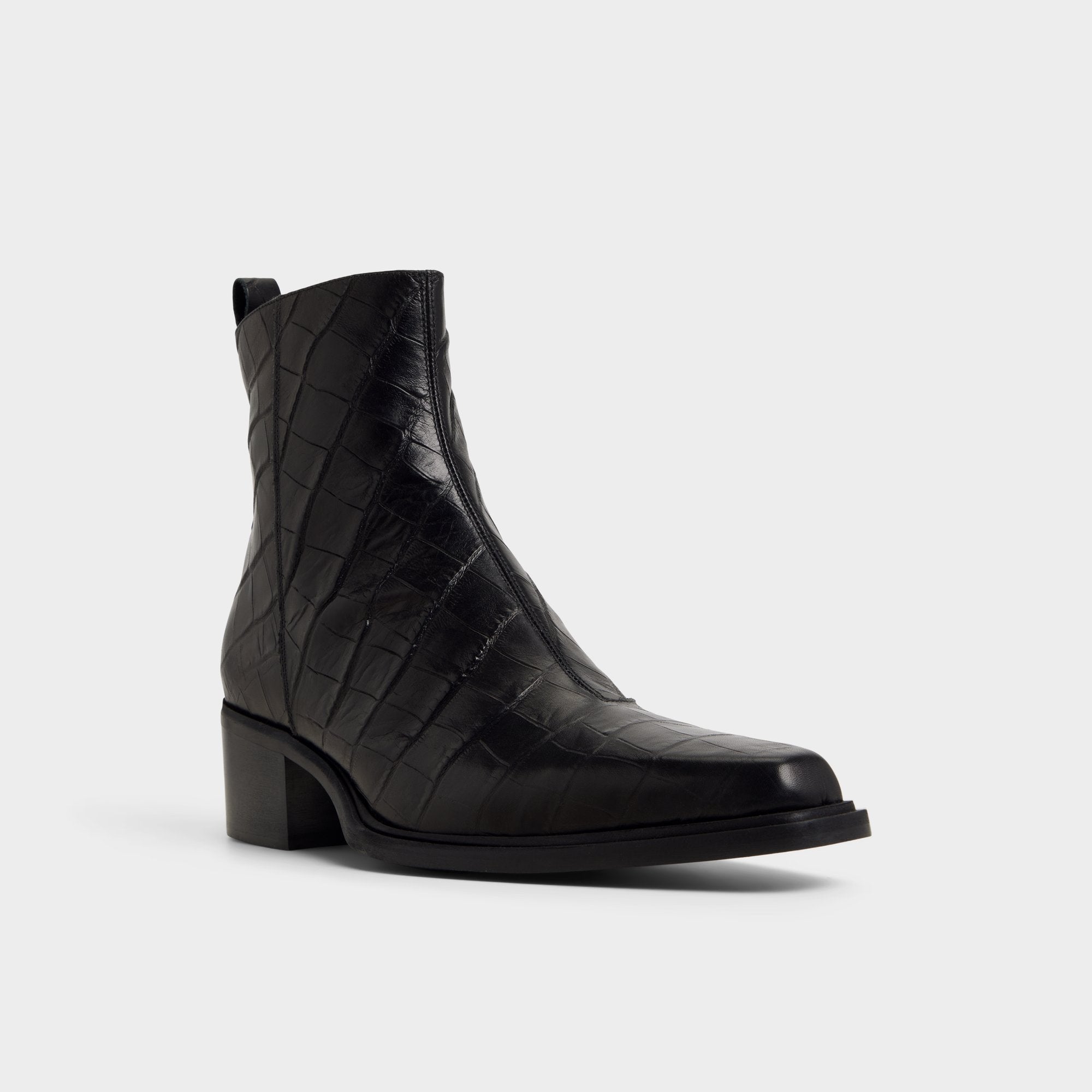 Croc-embossed leather shapes this point-toe ankle boot, a silhouette with a block heel and a discreet elastic panel for easy on and off that travels city blocks with quiet confidence. Pair it with charcoal denim for gig nights, or anchor it with a tailored overcoat for rooftop cocktails.