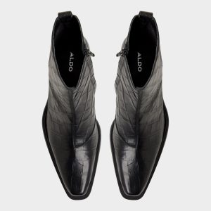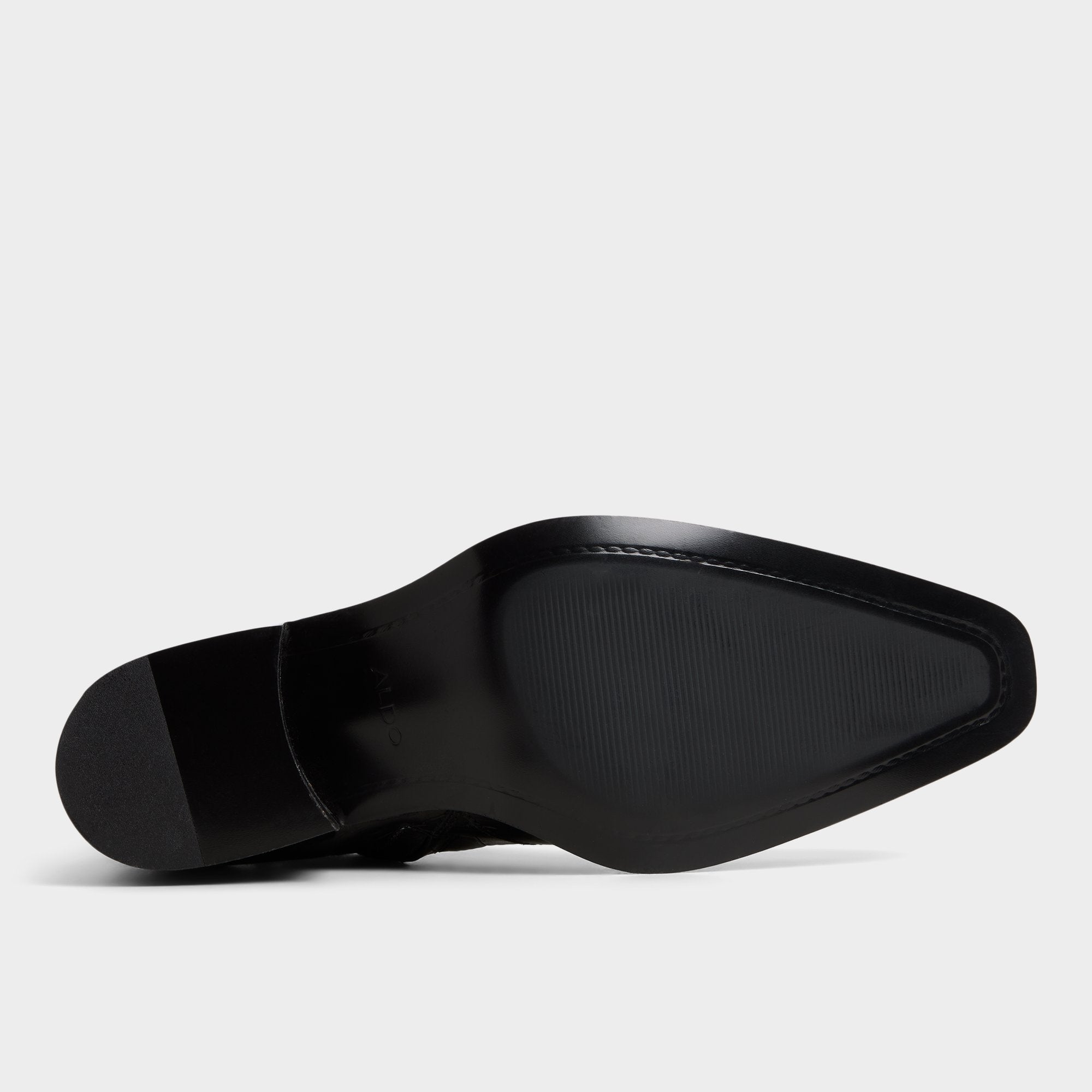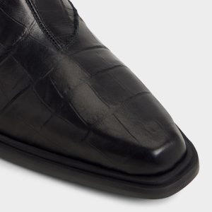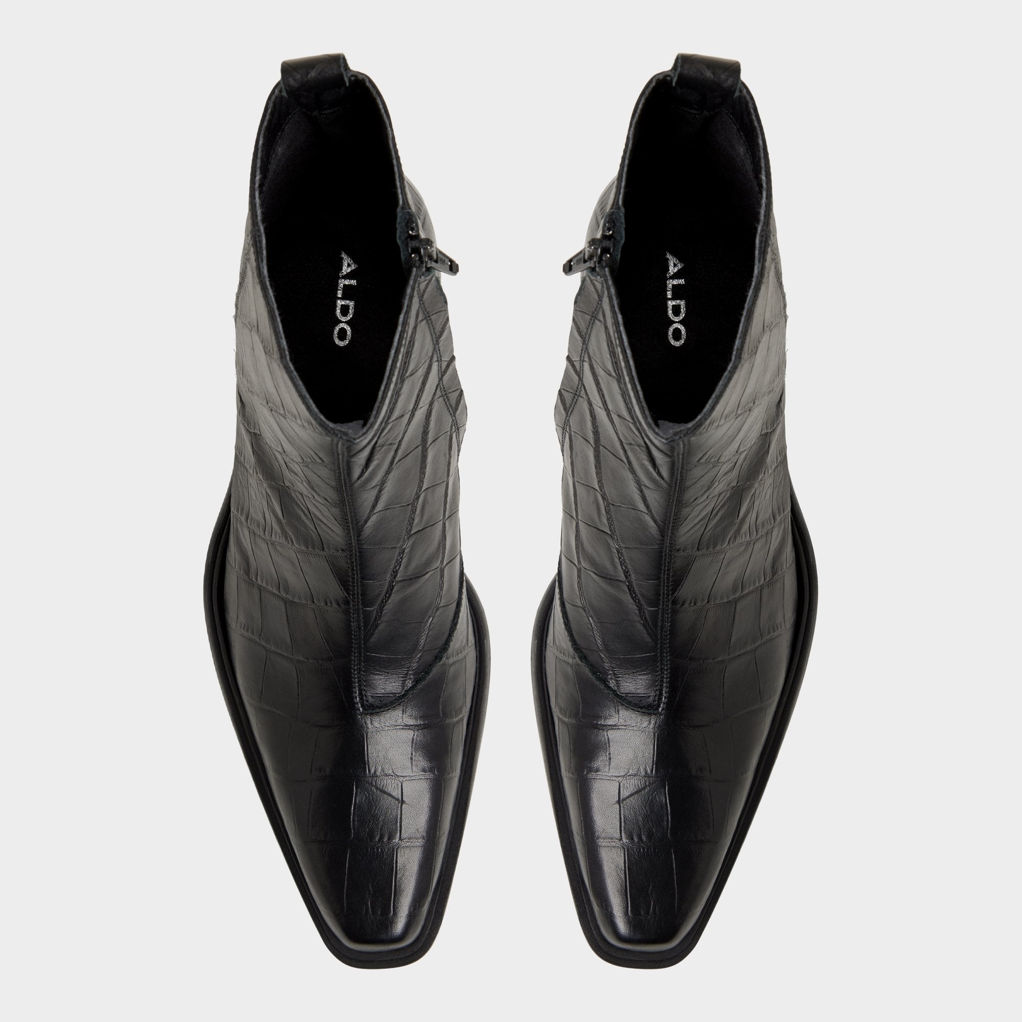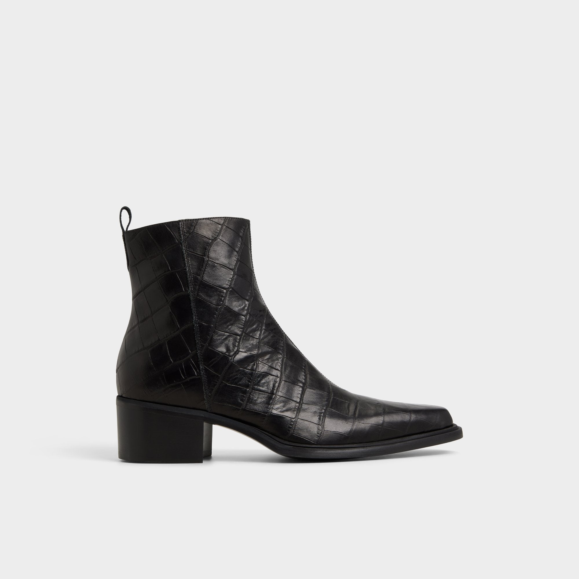 Croc-embossed leather shapes this point-toe ankle boot, a silhouette with a block heel and a discreet elastic panel for easy on and off that travels city blocks with quiet confidence. Pair it with charcoal denim for gig nights, or anchor it with a tailored overcoat for rooftop cocktails.