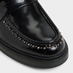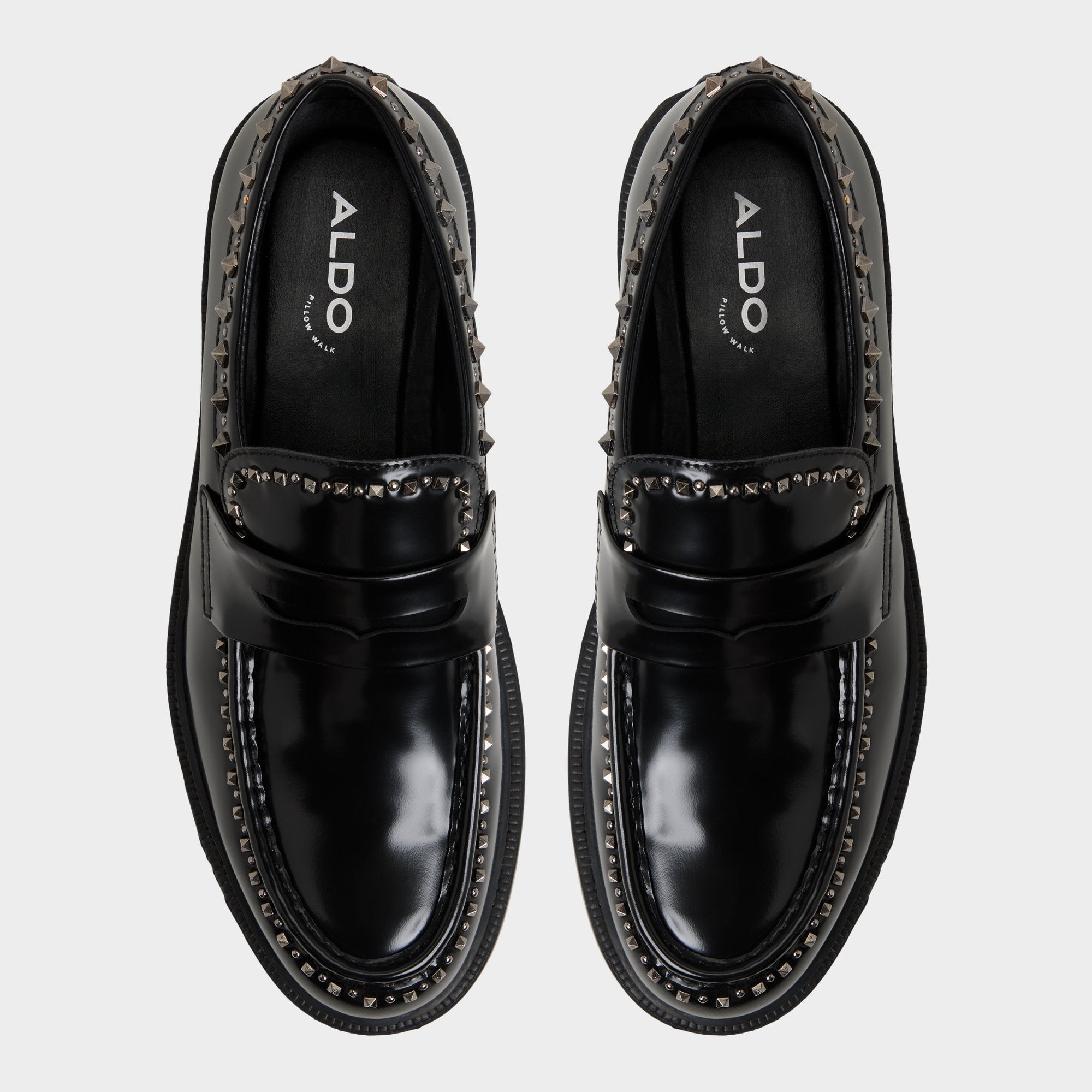 Patent leather gleams with matte studs across the loafer’s silhouette, giving a rebellious edge while the lug sole anchors each stride on city streets and beyond. Pair it with slim black denim for gallery nights or cropped trousers for after-work drinks, as the studded detail makes the look.